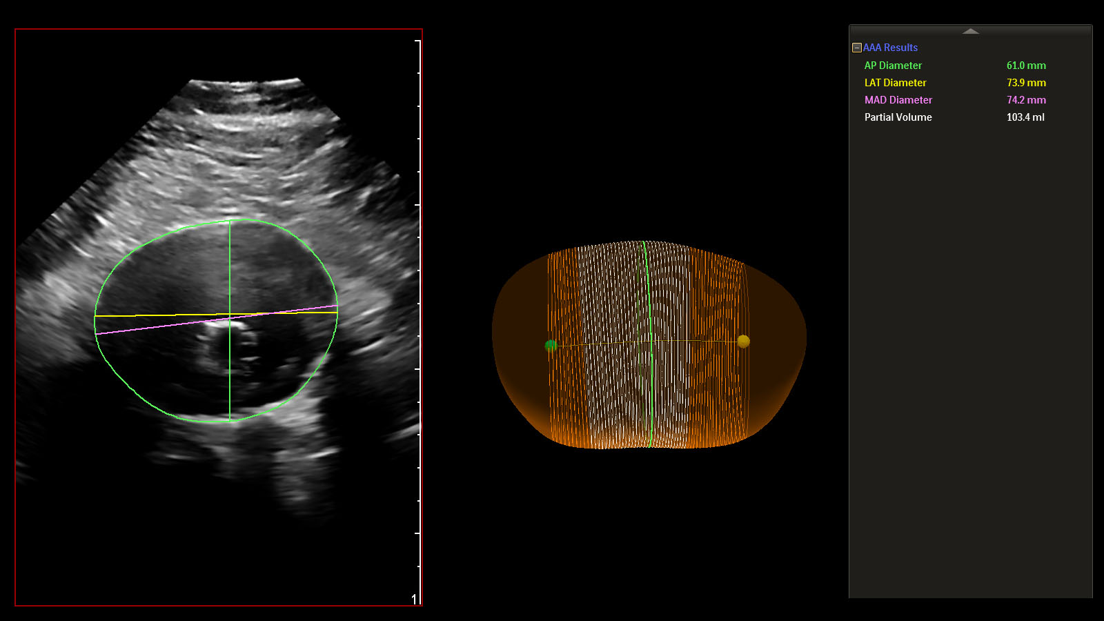 An abdominal aortic aneurysm (AAA) is an aneurysm that forms in the lower part of the aorta. Typically, AAAs are identified incidentally during abdominal imaging exams but, in some cases, remain undetected until rupture. A ruptured AAA has an 80% mortality rate [1], emphasizing the importance of routine surveillance. Philips AAA Model integrates innovative software and leading Philips 3D ultrasound technologies into a single solution to help increase diagnostic confidence and an improved patient experience. The software automatically segments and quantifies the size of the aneurysm sac for surveillance of known native (untreated), and post-EVAR (treated) AAAs.