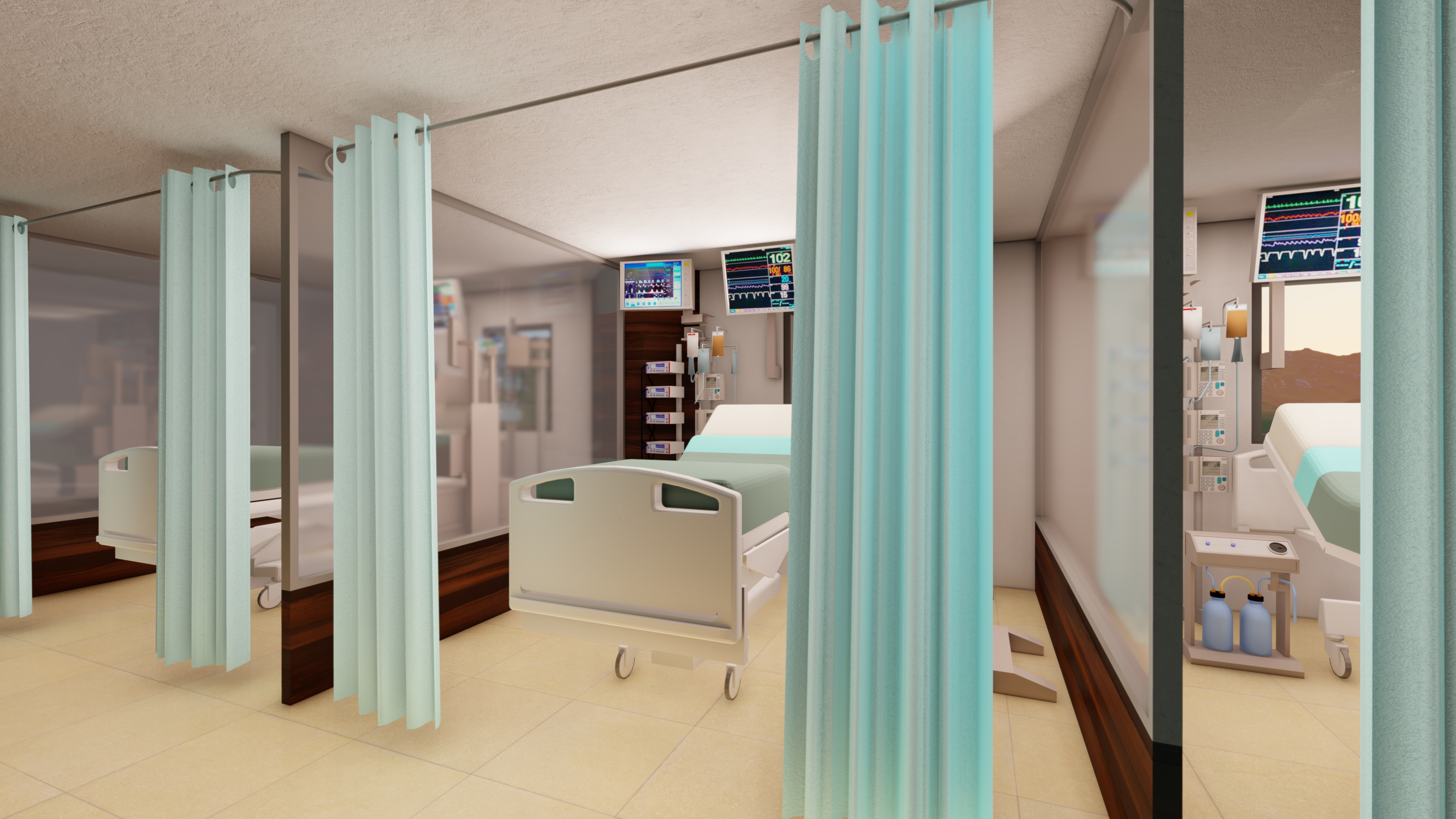 With a floor area of 1380 square feet (128 square meters), these self-sufficient units only require an on-site electricity and water connection to become operational. Each mobile ICU comes pre-equipped with a state-of-the-art critical-care infrastructure, such as independent patient cubicles, plus anti-bacterial paint and high-end washrooms with a self-disinfection facility to avoid cross contamination. The ICUs can be furnished with a range of medical equipment, including ventilators, defibrillators, a central monitoring station and CPAP (Continuous Positive Airway Pressure) machines, with appropriate supporting infrastructure such as back-up power, oxygen and vacuum supplies.