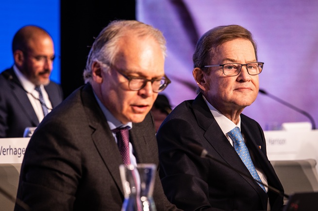Chairman Feike Sijbesma and a member of the Board of Management Marnix van Ginneken during Philips AGM 2025