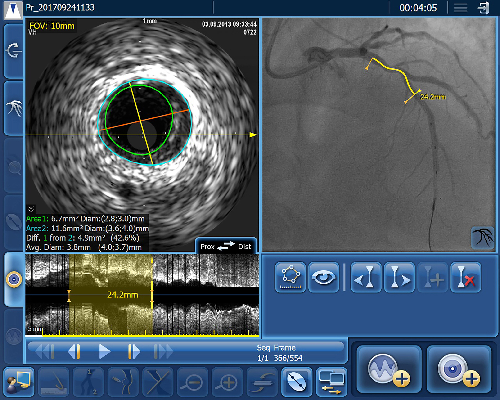 IntraSight Series 7’s IVUS co-registration facility merges real-time intravenous ultrasound and angiogram images, with information on the precise location of the ultrasound images derived during manual pull-back of the ultrasound catheter under continuous fluoroscopy. As a result, interventionists can simultaneously view reconstructed cross-sectional ultrasound images of the vessel lumen, including their precise position on the angiogram. This level of precision significantly reduces the risk of a ‘geographic miss’, which has been estimated to occur in over 60% of PCIs [3]. IntraSight Series 7’s Angio+ quantitative coronary analysis software automatically calculates lumen dimensions and stenosis in real time, helping accurate assessment of the required stent size.