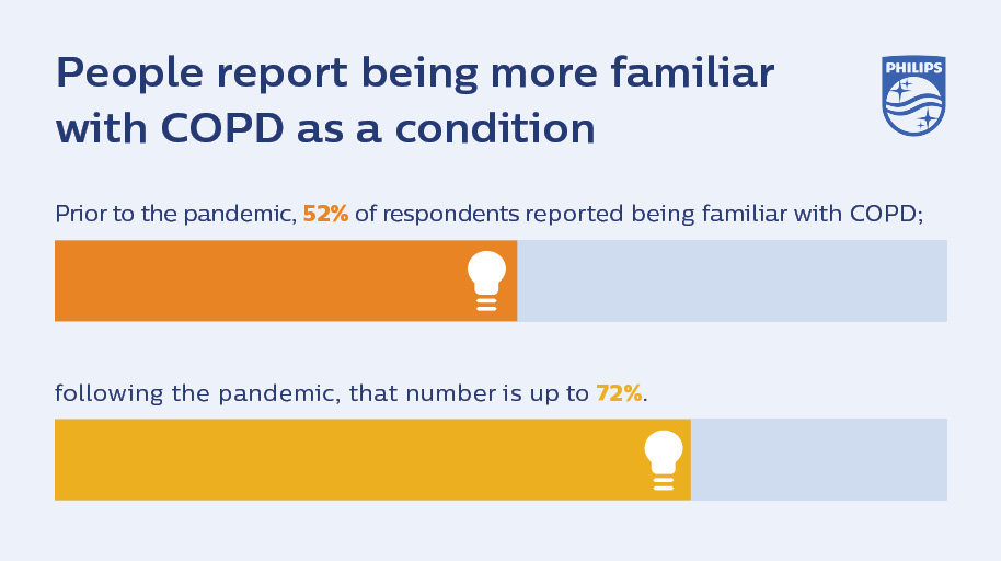 While COVID-19 may have exacerbated individual concerns for the nearly 65 million people [2] currently living with COPD, it also brought increased awareness for the chronic condition across the globe. Nearly three in five people report being more familiar with COPD now compared to prior to the COVID-19 pandemic, which may be directly linked with increased education around respiratory illnesses due to the nature of COVID-19. Prior to the pandemic, 52% of respondents reported being familiar with COPD; that number is now up to 72%.