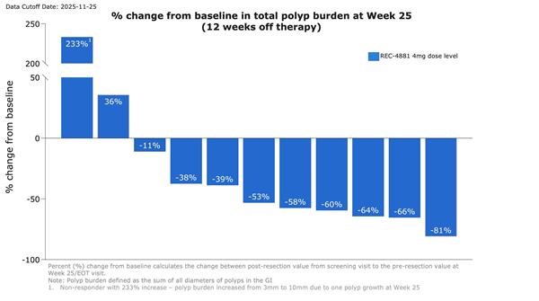 - REC-4881 produced a median 43% reduction in total polyp burden among 12 efficacy-evaluable patients.