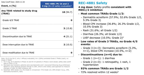 - REC-4881 (4 mg QD) has a safety profile consistent with MEK1/2 inhibition, with the majority of treatment-related adverse events being Grade 1 or 2, Grade 3 events occurring in 15.8% of the safety-evaluable patients, and no Grade ≥4 TRAEs reported to date