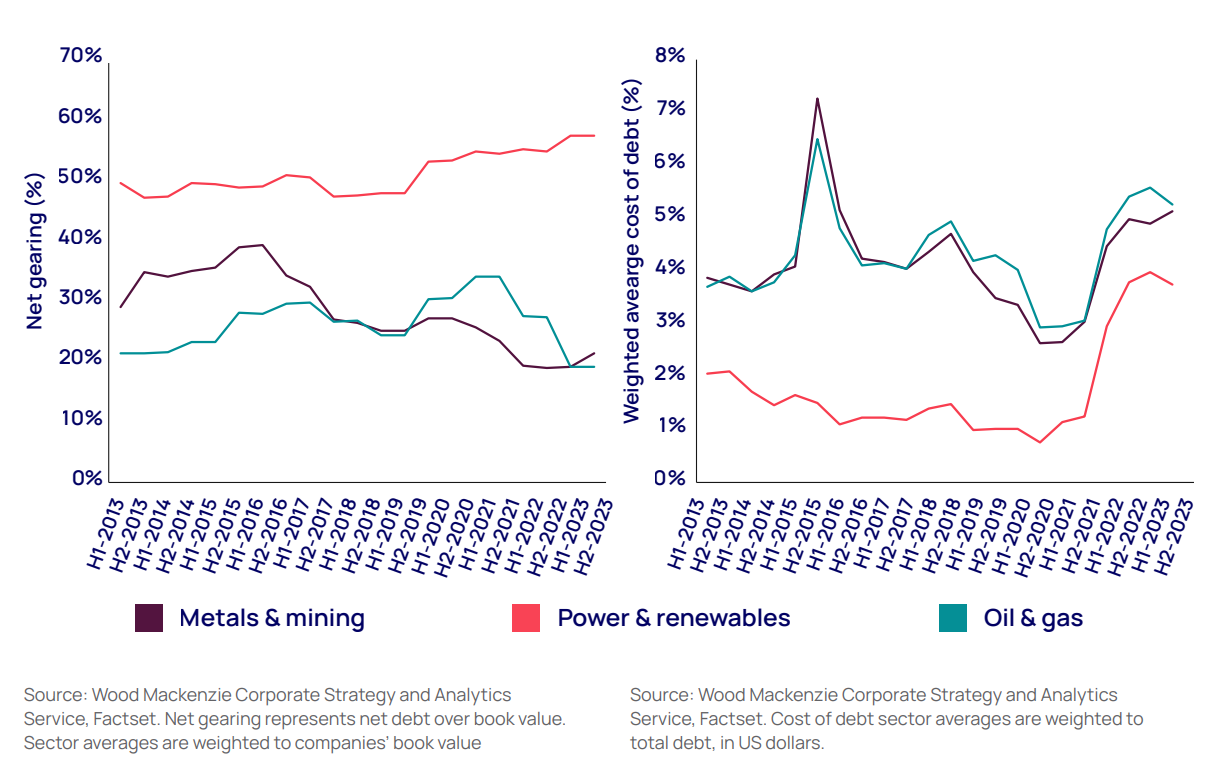 “While power and renewables companies have higher gearing, they do compare favourably with other peer groups on a cost-of-debt basis. But this is precisely what makes them more sensitive to interest rates. Mechanisms to reduce price and offtake risk enable power and renewables companies to obtain debt more cheaply than the relatively risky oil and gas and metals and mining sectors. The recent rise in interest rates, therefore, has a larger proportional impact on their cost of debt,” Martin said.