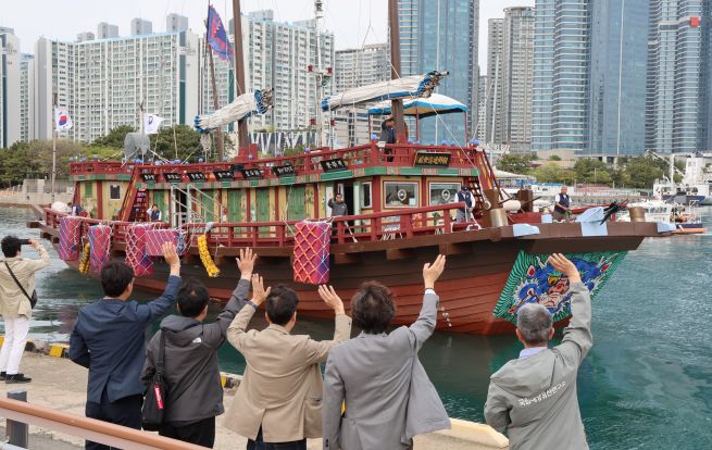 The Busan Cultural Foundation announced that the vessel departed from Yongho Starlight Park in Busan’s Nam-gu district on April 28. The ship is modeled after the Jeongsa Giseon, the main vessel historically used by the head envoy (jeongsa) of the Joseon Tongsinsa — diplomatic missions dispatched by Korea’s Joseon Dynasty to Japan.