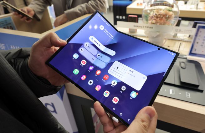 A hands-on display unit of Samsung Electronics’ twice-folding smartphone, the Galaxy Z Tri-Fold, is on display at the Samsung Store in Lotte Department Store’s main branch in central Seoul on Jan. 6, when the company conducted the device’s third round of sales. (Yonhap)
