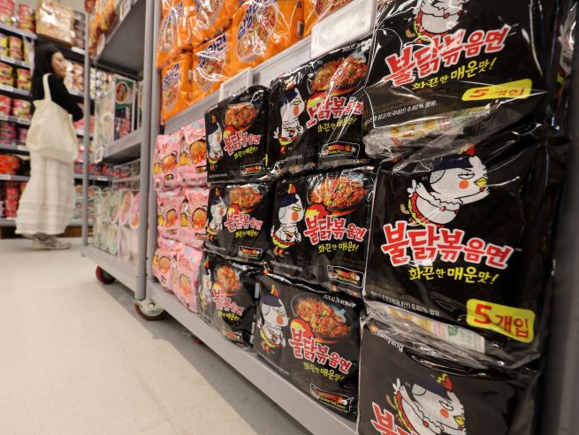 Launched in 2012, Buldak spicy noodles have seen surging overseas demand, with cumulative sales surpassing 5 billion units in 2023 and 7 billion in 2024, before topping 8 billion in the first half of this year. The photo shows Buldak noodles displayed at a large supermarket in Seoul. (Image courtesy of Yonhap)