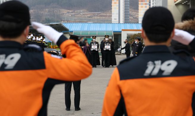 Fellow firefighters salute in honor of their fallen colleague, paying final respects (Yonhap)