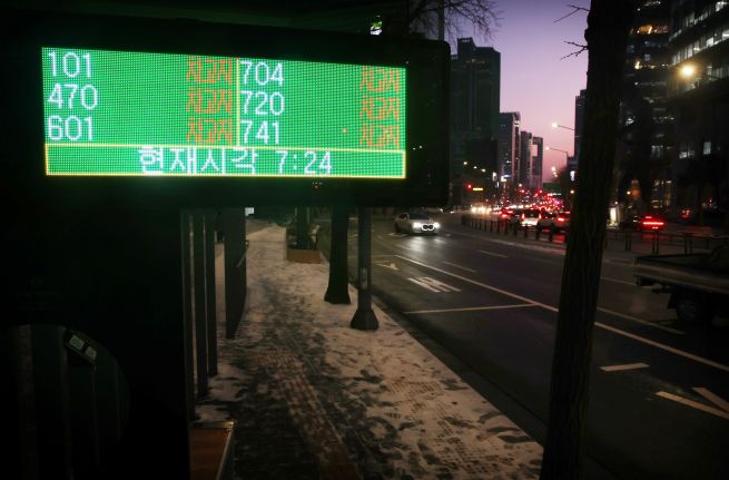 A signboard at a bus stop in Seoul on Jan. 13, 2026, shows all buses are parked at a depot. (Yonhap)