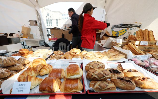 At the French booth at the 14th European Christmas Market held in front of the Seongbuk District Office in Seoul on December 7, breads including baguettes are on display.