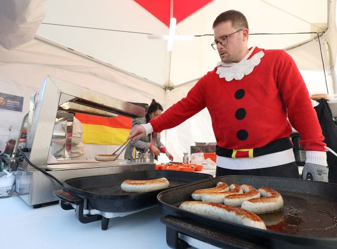 At the German booth of the 14th European Christmas Market held in front of the Seongbuk District Office in Seoul on December 7, a staff member dressed as Santa grills sausages.