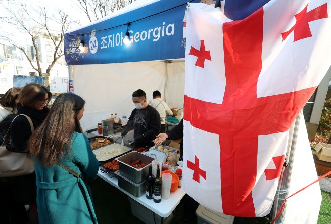 At the Georgia booth at the 14th European Christmas Market held in front of the Seongbuk District Office in Seoul on December 7, ojakhuri, khinkali and kupati are prepared and on display.