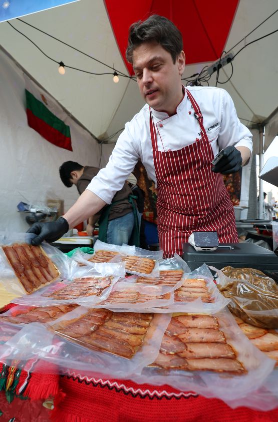On December 7, at the 14th European Christmas Market held in front of the Seongbuk District Office in Seoul, Chef Mikael Ashminov — also well known as a television personality — sells ham at the Bulgarian booth.