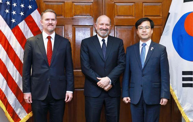 Yeo Han-koo (R), South Korea's new trade minister, poses for a photo with U.S. Trade Representative Jamieson Greer (L) and U.S. Commerce Secretary Howard Lutnick during their meeting in Washington on June 23, 2025, in this file photo released by the South Korean industry ministry.  (Yonhap)