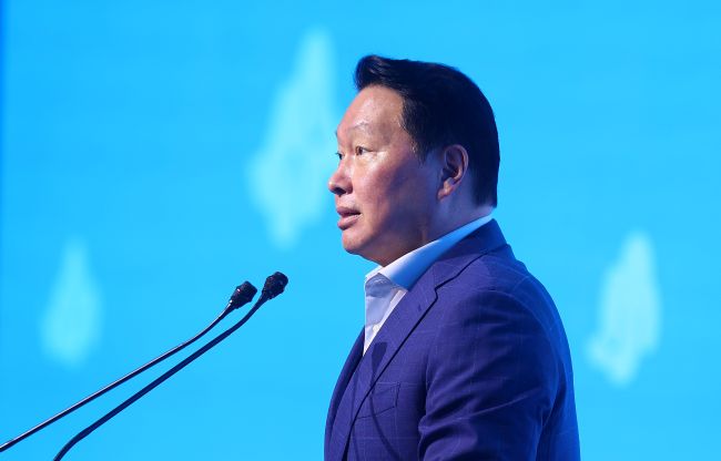In this file photo taken July 16, 2025, Chey Tae-won, chairman of South Korea’s SK Group, delivers the opening speech at a summer forum hosted by the Korea Chamber of Commerce and Industry (KCCI) at a hotel in Gyeongju, about 275 kilometers southeast of Seoul. (Image courtesy of Yonhap)