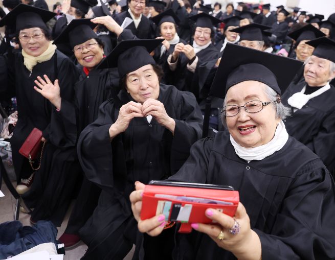 Elderly participants wearing graduation caps pose for a commemorative photo at the 29th graduation ceremony of a senior citizens’ college, held on Dec. 29 last month at the Dongan Senior Welfare Center in Anyang, Gyeonggi Province. (Yonhap)