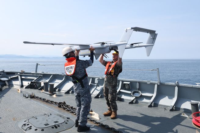 Drones are being used in various ways in the military. On August 21, during an exercise in the East Sea, the Armed Forces Daejeon Hospital drone team and crew members of the Hyunshihak ship used a drone to deliver a patient’s specimen to the fleet medical unit. (Photo provided by the Republic of Korea Navy’s First Fleet Command)