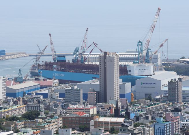 On the afternoon of July 31, the day the Korea-U.S. trade agreement was concluded, a ship under construction is seen at Hanwha Ocean’s Geoje shipyard in Aju-dong, Geoje City, South Gyeongsang Province. (Yonhap)