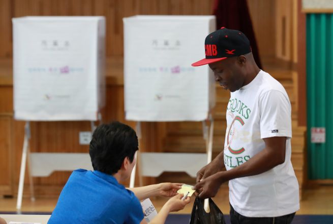 On June 13, 2018, at the Education and Culture Center of Itaewon Elementary School in Yongsan-gu, Seoul, Uguoma Obinna Samuel, a 52-year-old factory worker from Nigeria, checks the voter list at a polling station for the local elections. Foreign nationals who have held South Korean permanent residency for at least three years and are registered in the local government’s foreign resident registry are eligible to vote in local elections. (Yonhap)