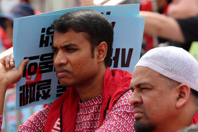On April 28, 2024, three days before International Workers’ Day, migrant workers gathered at a May Day rally in Seoul Station Plaza, listening to testimonies from victims of wage theft. (Yonhap)