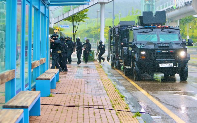 On June 24, 2023, a joint anti-terrorism comprehensive drill involving relevant agencies was held in preparation for the 2025 APEC Summit, around the Orasia Station area in Gijang-gun, Busan. (Photo courtesy of Busan Police Agency)