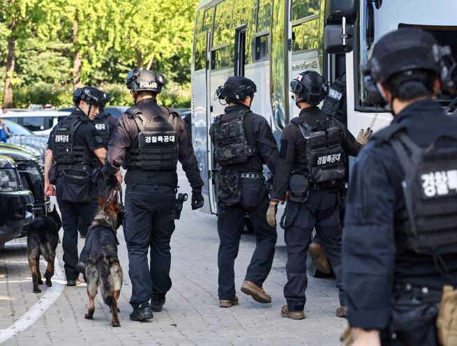 On August 10, a bomb threat was reported at the KSPO Dome (Olympic Gymnastics Arena) in Seoul’s Olympic Park, and the special forces, having completed their search, are moving out. (Yonhap)