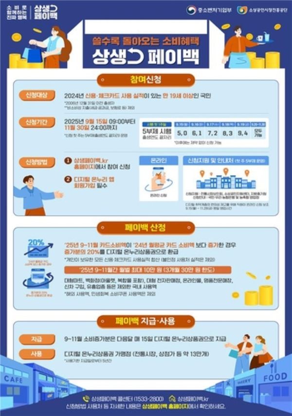 The Ministry of SMEs and Startups said Wednesday that the “Coexistence Payback” scheme will run from September through November, offering monthly refunds of up to 100,000 won ($74) — capped at 300,000 won over three months — for adults whose card spending exceeds their 2024 monthly average.