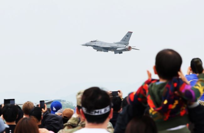 On May 11, at Osan Air Base in Pyeongtaek, Gyeonggi Province, South Korea, during the “Osan Air Power Day 2025,” a U.S. Pacific Air Forces F-16 fighter jet performed a special flight demonstration. (Image courtesy of Yonhap)