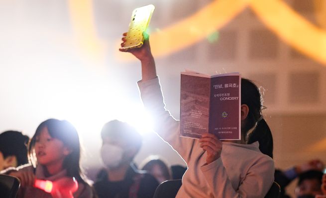 A current student waves while enjoying the “Goodbye, Wolgok Elementary” concert held on Dec. 10 at the school auditorium in Dalseo District, Daegu. The concert was organized ahead of the school’s closure and invited local residents to attend. Wolgok Elementary School will close on March 1, 2026, after 33 years of operation, due to a decline in the school-age population.