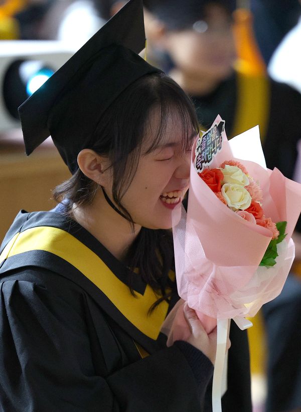 A sixth-grade student smiles brightly during the graduation and school closure ceremony held on Jan. 5 at Wolgok Elementary School in Dalseo District, Daegu. The school will close in March due to a decline in the school-age population, marking the occasion with its 33rd graduation ceremony alongside the closure event.