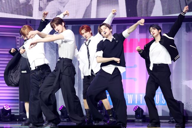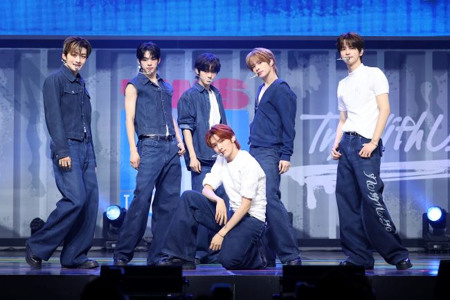 K-pop boy group TWS performs the lead track of its third EP, “Try With Us,” at a concert venue in Seoul on April 21, 2025. (Image courtesy of Yonhap)