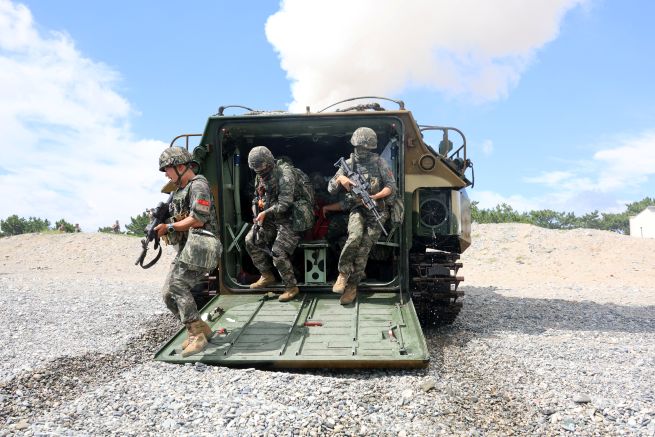 During the KMEP joint amphibious training, a Korean Amphibious Assault Vehicle (KAAV) is conducting a maritime assault. (Photo courtesy of South Korean and U.S. Marine Corps)