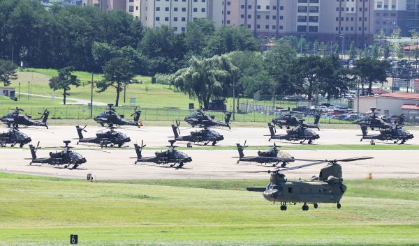 On August 7, a CH-47 Chinook helicopter is seen moving at Camp Humphreys in Pyeongtaek, Gyeonggi Province, as South Korea and the United States announced that they will conduct the regular joint exercise ‘Ulchi Freedom Shield’ (UFS) for the defense of the Korean Peninsula from August 18 to 28. (Yonhap)