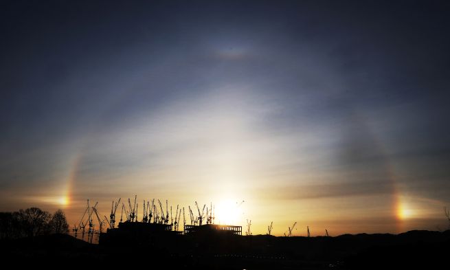 On Jan. 1, the first day of the new year, a sun halo appears around the first sunrise of 2026, the Year of the Fire Horse (Byeong-o), above the construction site of SK hynix’s Yongin Cluster Phase 1 fab in Wonsam-myeon, Cheoin-gu, Yongin, Gyeonggi Province. (Yonhap)