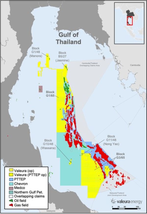 Block G1/65 comprises a gross area of 8,487 km2 immediately south of Valeura’s B5/27 block (Jasmine/Ban Yen fields, 100% Valeura interest) and west of PTTEP-operated large gas fields (Erawan, Platong, and Benchamas, currently producing 900 mmcf/d, 27 mbbls/d condensate, and 23 mbbls/d oil, respectively, based on May 2025 production data disclosed by Thailand’s Department of Mineral Fuels).