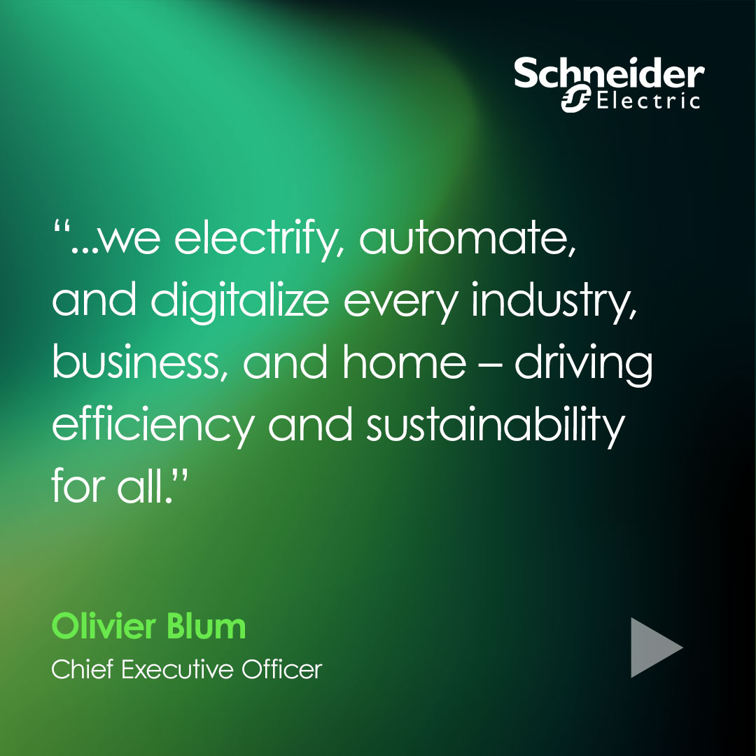 “Everything we care about, our planet, our people, our partners, depends on energy,” said Blum. “But today, energy must do more. It must empower us to innovate, compete, and to create a future that’s sustainable and resilient. Schneider Electric is your energy technology partner. We electrify, automate, and digitalize every industry, business, and home, driving efficiency and sustainability for all.”