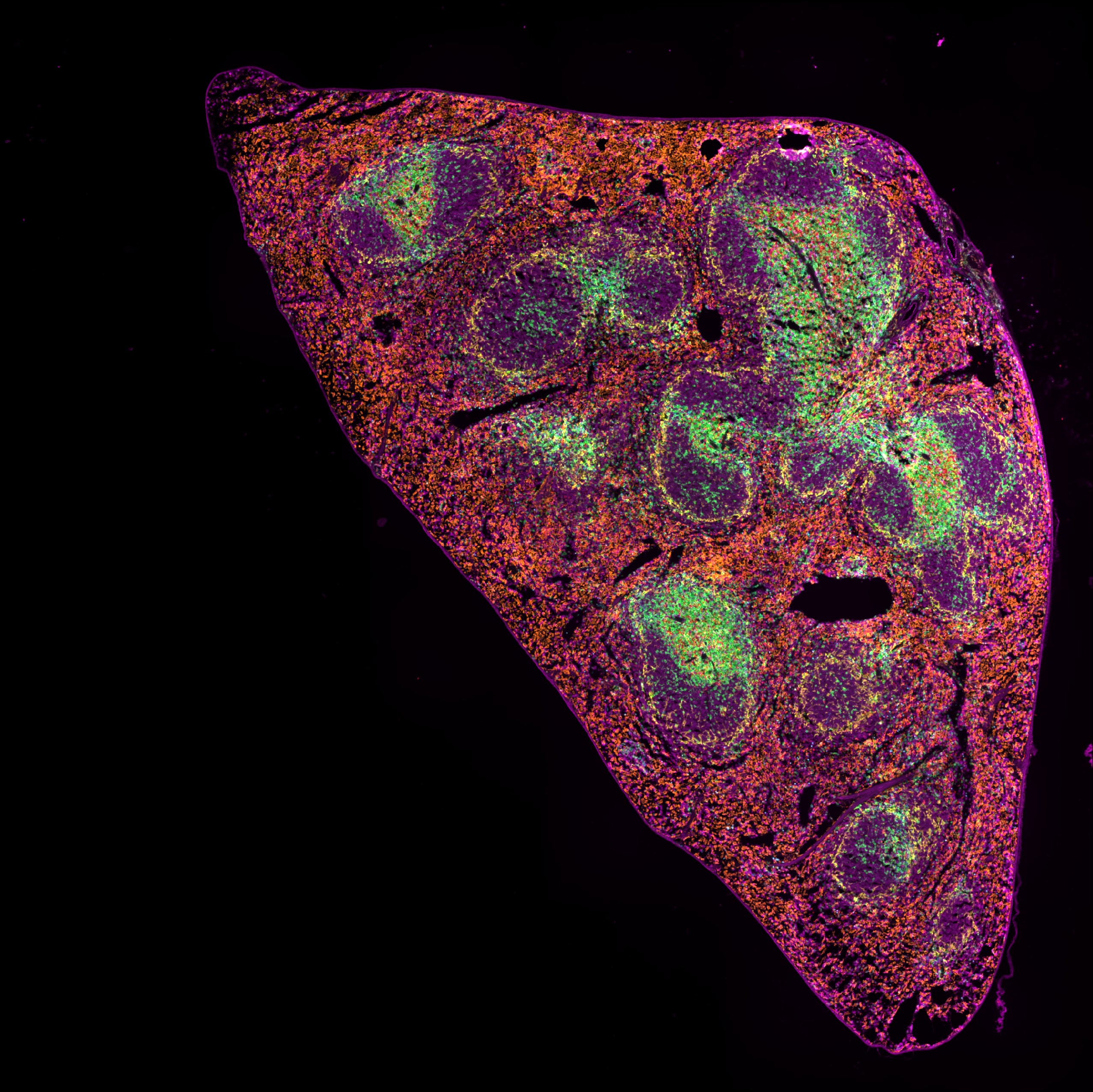 5 μm FFPE section of mouse spleen simultaneously stained with 7 IF markers plus DAPI (not shown). Imaged on ZEISS Axioscan 7 spatial biology
